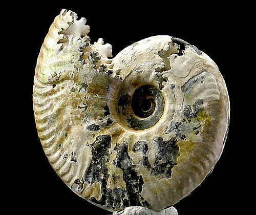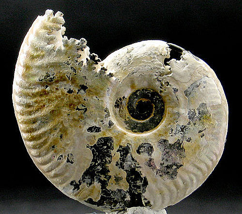 另外觀察的部份就是這個菊石的殼口處,不像一般看到的平整狀,而是接近原生理型態的不規則肌肉狀,非常漂亮。