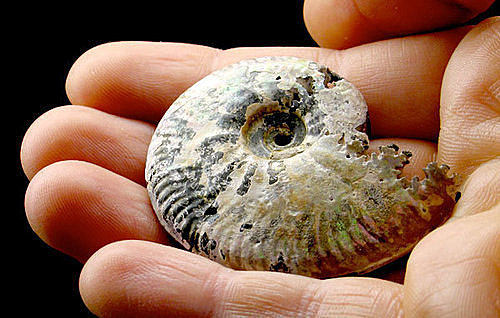 可惜這菊石不大 4.5 x 3.4 cm,每次拿都得要小心翼翼的,摔下去可是會毀了。注意看右下角有彩光反射。