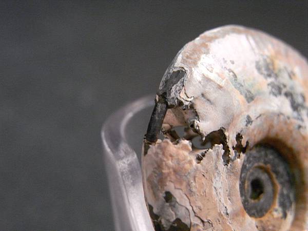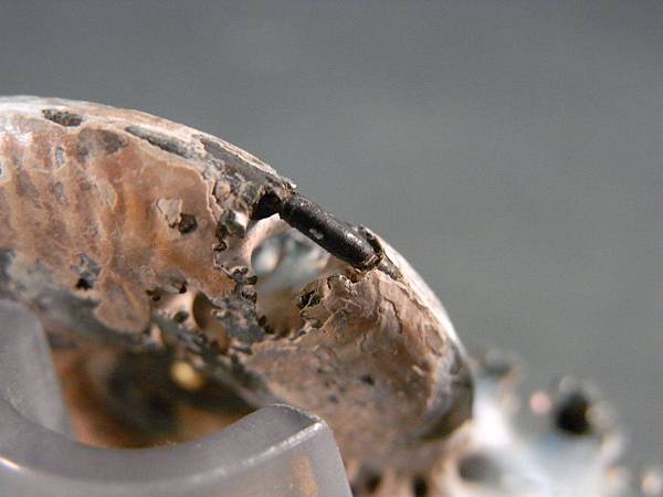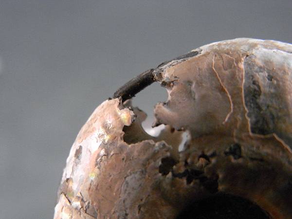 請大家注意看!! 上方處有破殼,但遺留一段黑黑的管狀,那就是菊石的【體管】。菊時的體管長在外面腹側,鸚鵡螺的體管則是長在裡面螺旋狀穿過每個隔間。