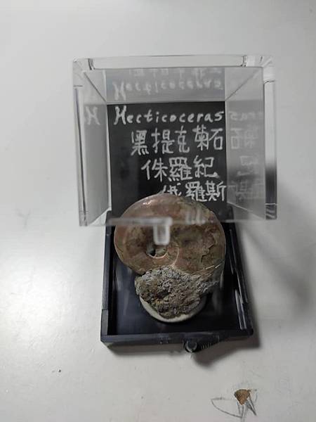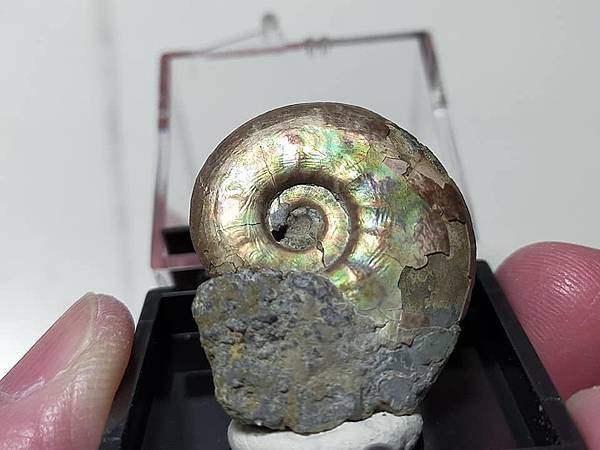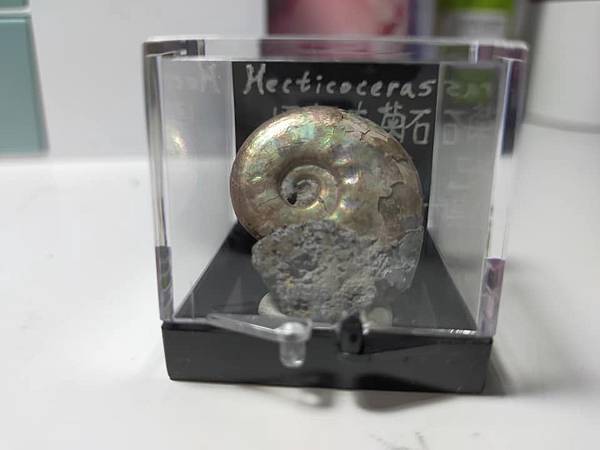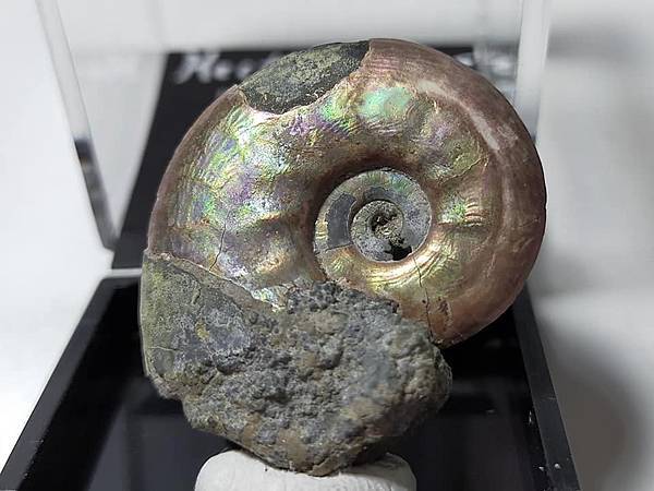 這個俄羅斯黃鐵礦化的黑提克菊石經過不同角度的光線照射,會反射出綠色、青色、紫色、紅色、橘色等彩光,跟加拿大的彩斑菊石比起來真是不遑多讓,但價錢便宜很多,通常加拿大彩斑菊石的小破片比這一顆還貴。