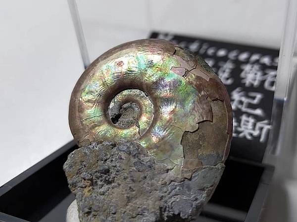 所以一般菊石化石只要外殼還留著,通常都會有彩遊現象,甚至會有只剩薄薄的殼仍有彩遊光但因為殼薄卻又可以看到殼下的縫合線,這種雙重美麗真是菊石的極品。