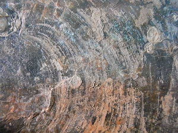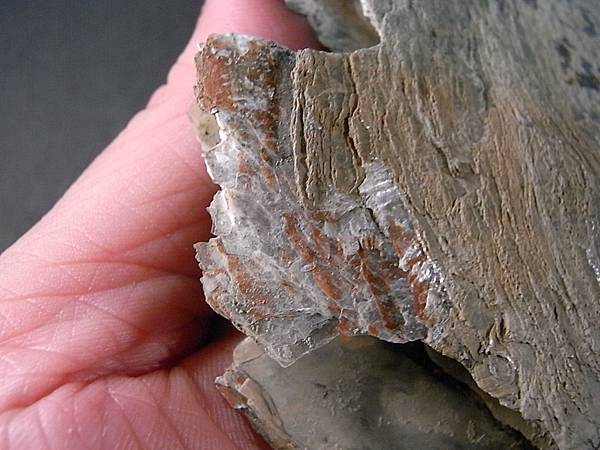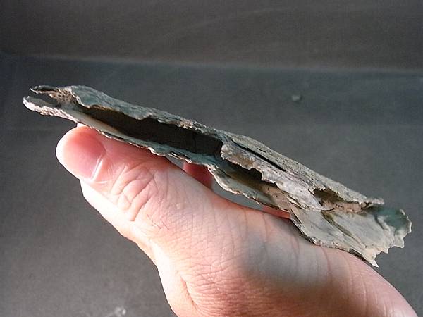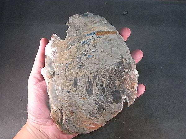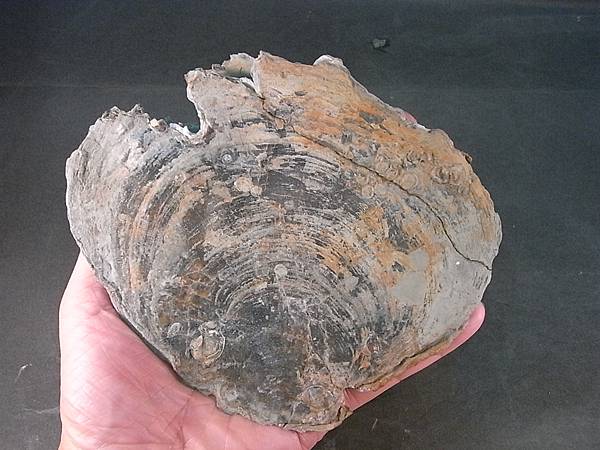 這是採集台南菜寮溪流域的雲母蛤。雲母蛤身形大片但扁平,化石質地很差,稍微碰到就會破裂,所以採集要小心,保存也要小心。雖說如此,但它美麗的紋路及珍珠般的珍珠層還是很迷人。