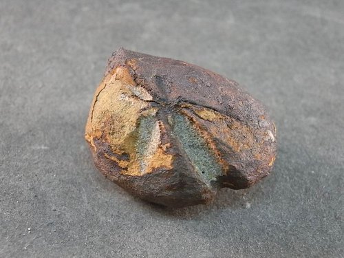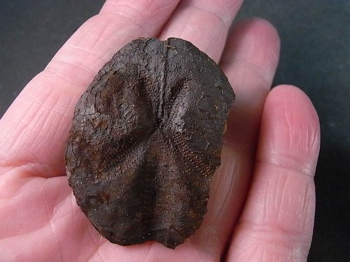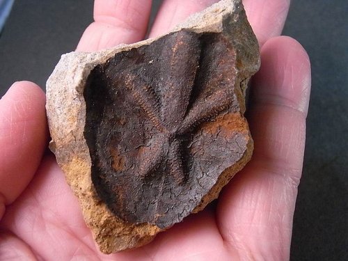 油亮瀝青的海膽,彷彿被烤焦過,是地層作用的結果。外型上瓣帶紋呈 X 形、身體扁平,應該是未命名的新種海膽,亦或是身體被壓扁導致瓣帶紋呈 X 形,有趣的議題,讓有興趣的人去研究吧!