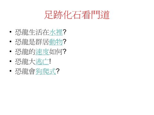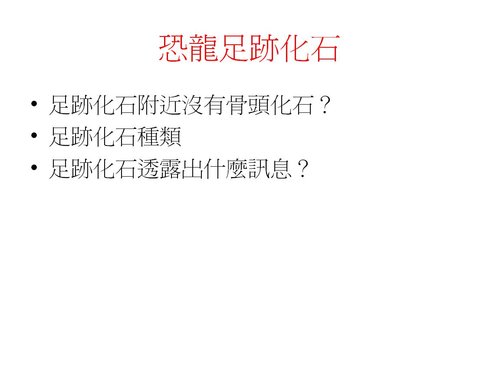 這是化石狂報告的題目 "恐龍足跡化石" 的內容ppt檔,裡面內容有不周全或錯誤之處,再請大家多多指教,謝謝囉~