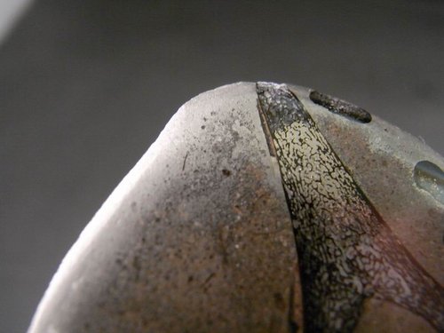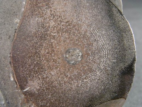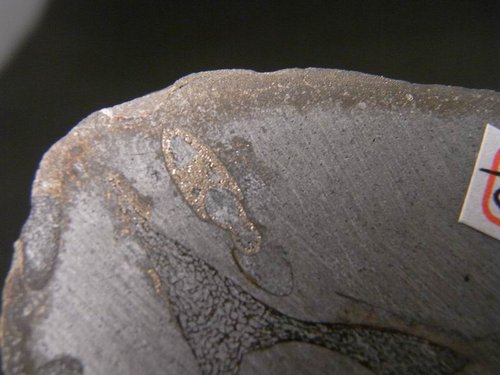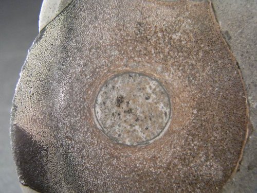 背面未拋光的部分,很明顯黃鐵礦填充,石頭周圍也都是黃鐵礦填充,圖上那顆則是黃鐵礦小菊石的縱切面(感謝劉sir的指導)