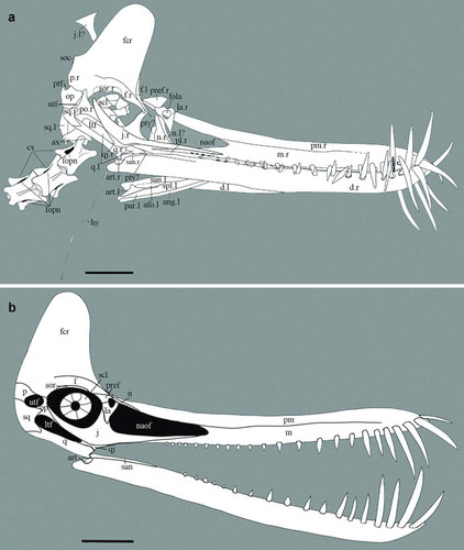 獵手鬼龍(Guidraco venator gen. et sp. nov.)正型標本與頭骨復原圖(比例尺5cm)(汪筱林供圖)