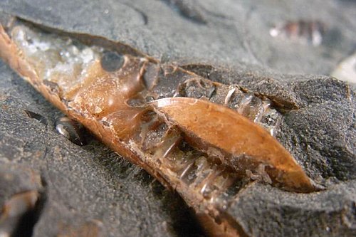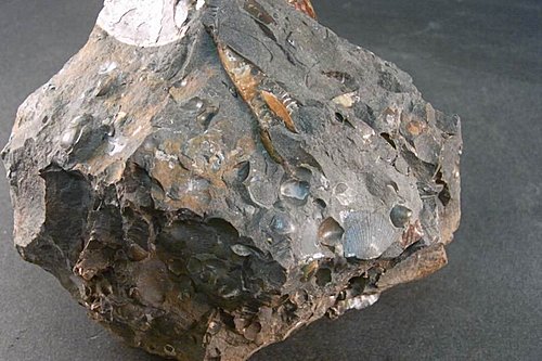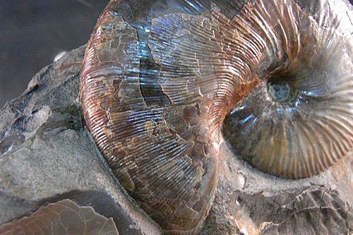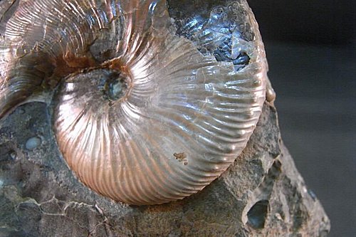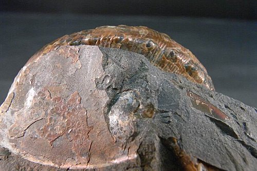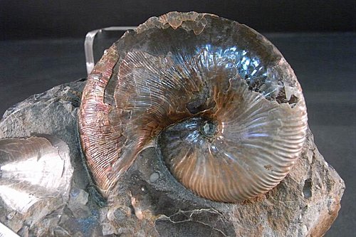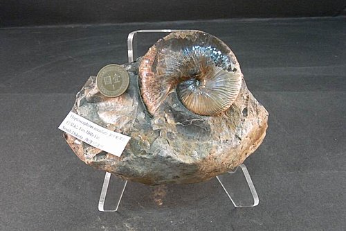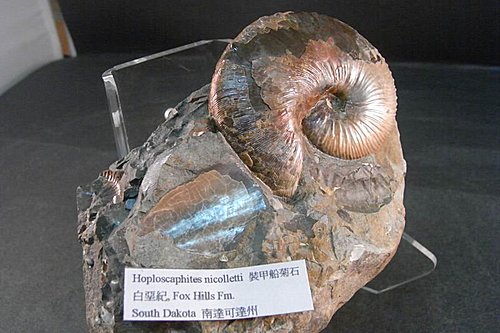 這是一顆母岩頗大(球狀結核)、菊石本體也蠻粗勇(6cm) 的南達可達州著名狐狸丘地層產的白堊紀尼可列特氏裝甲船菊石。外殼及腹側都保存很好,是很值得收藏的好標本。