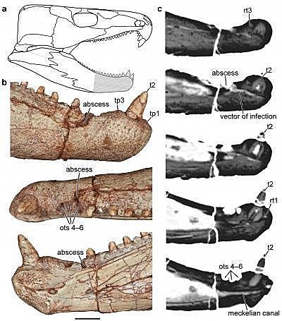 由加拿大多倫多大學生物系教授瑞茲博士(Dr. Robert Reisz)所領導的研究團隊發現,證據顯示有古生代爬蟲動物因為口腔感染造成骨骼受損傷。他們的發現將刊登於線上期刊《自然科學(Naturwissenschaften)》,比先前陸生脊椎動物口腔與牙齒疾病的記錄還要早2億年。