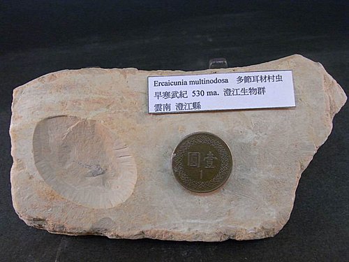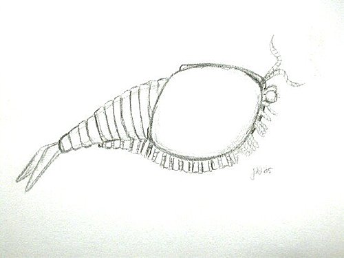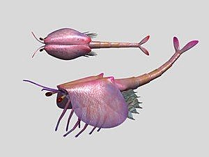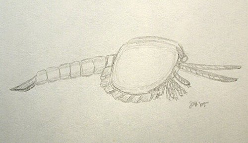 多節耳材村虫的復原圖(上圖),很像另一種著名的澄江生物 - 瓦普塔蝦(Waptia)(下兩圖),差別在於多節耳材村虫身體擁有更多的節。其實比起瓦普塔蝦,多節耳材村虫更像"翼尾盾虾"(Clypecaris pteroidea) ,很有可能是同種異名。說真的大陸在物種的命名方面,動不動就命新種,這點被全世界的古生物專家廣為詬病。