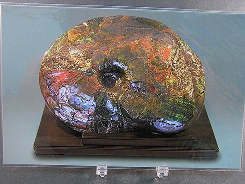 俗稱 斑彩石 Ammolite ,由霰石 (aragonite) 組成,所以外殼有遊彩現象(play of color)
