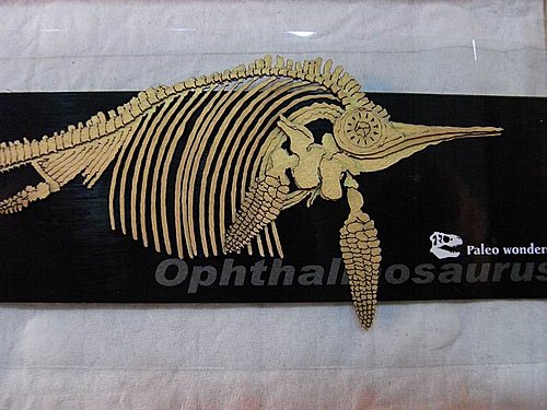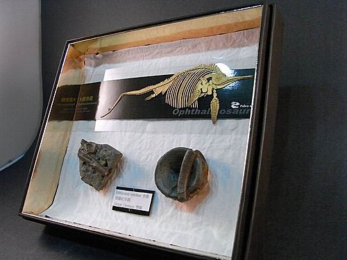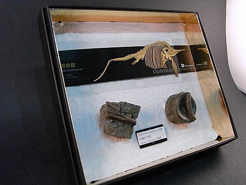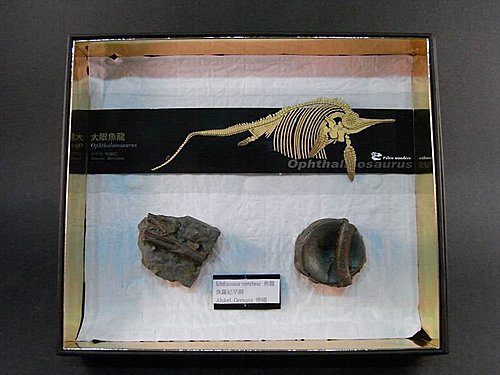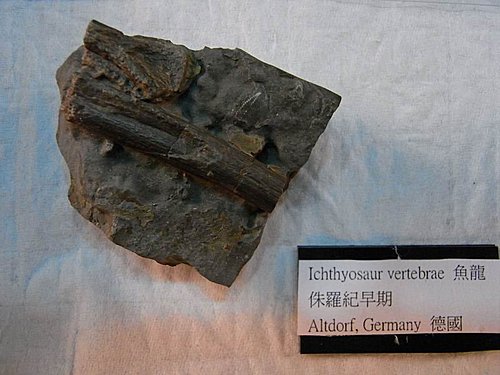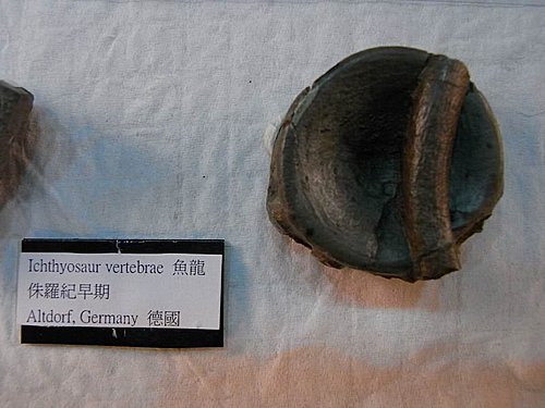 德國的魚龍非常有名,這個標本是一小節魚龍脊椎的骨盤及兩根細骨所組成。其中盤狀中間凹陷的椎骨盤相傳以前古人還不知道化石這東西時,在中間注入燈油及心蕊,拿來當油燈呢!很有趣吧。