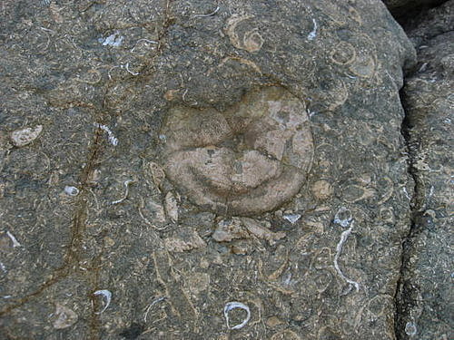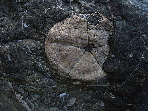 話說前幾天大夥揹著厚重的工具,滑下山坡、涉水過溪、穿過荒煙蔓草,終於找到盾海膽的露頭,大夥頂著35度的高溫及大太陽,辛苦的想把盾海膽從厚實且硬的母岩裡敲出來。