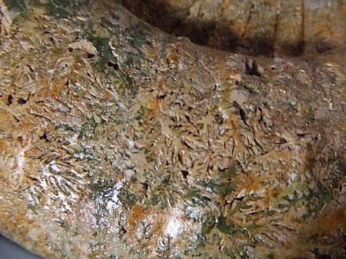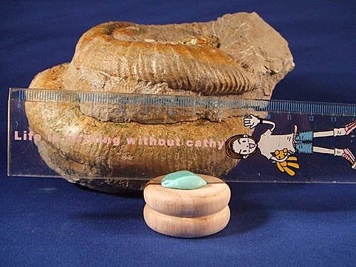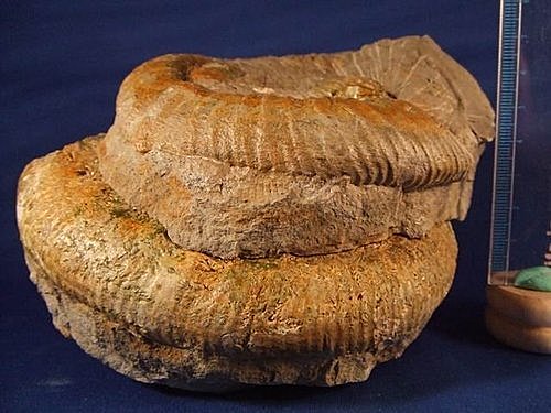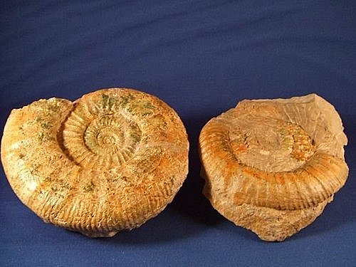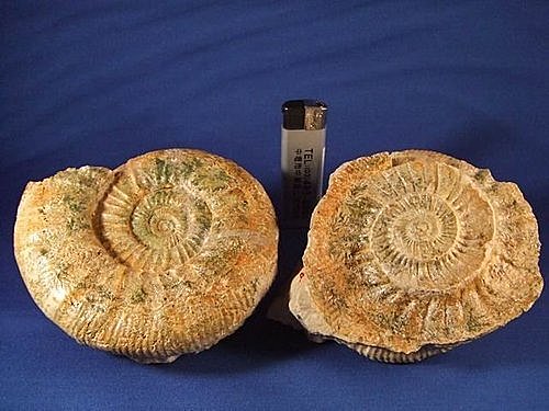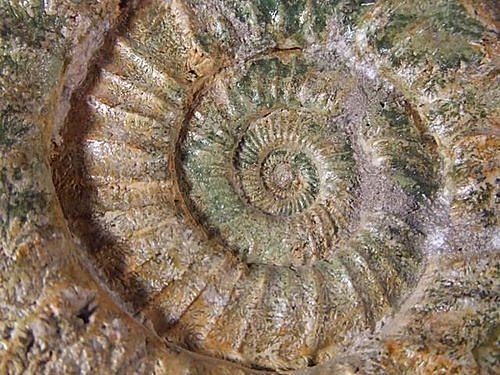 德國產的正旋菊石表面都會綠綠的,那是因為化石內含一種礦物 Glaukonit (海綠石)。