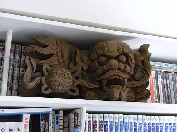 憨獅本來有一對,有一隻調皮離家出走,不知道跑到哪裡了。這一隻被我領回家養之後,也喜歡亂跑,最喜歡跑到書架上去休息。