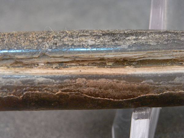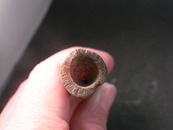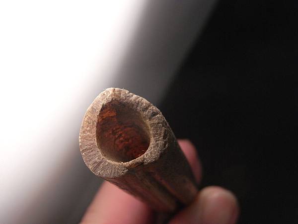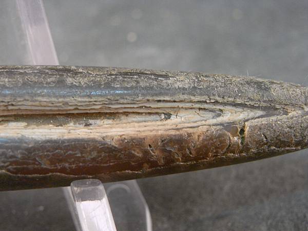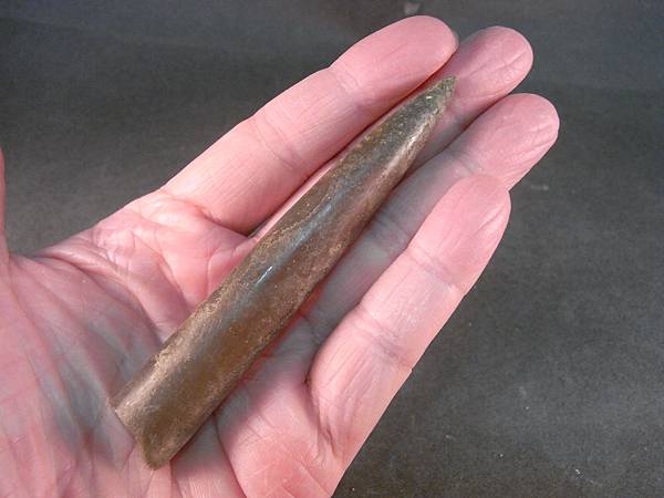 圓柱箭石比一般常見的英國箭石或德國箭石都還要長且圓胖,一般長20cm左右,這支則10cm左右而已。又一般常見20cm左右的圓柱箭石來自英國,這支則是來自俄羅斯,中間有附著軟體組織用的溝槽,尾端則有連接閉椎的空腔室,是一個很好的標本。