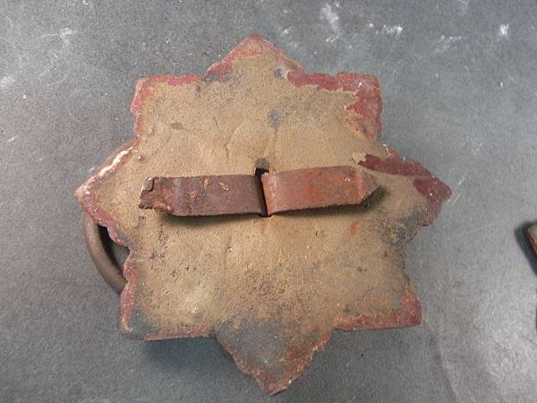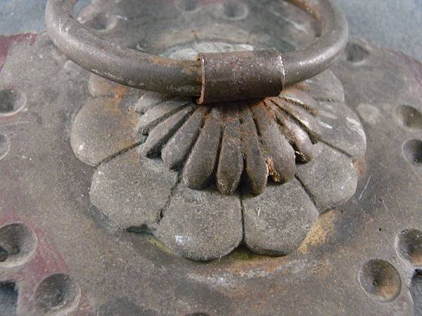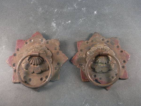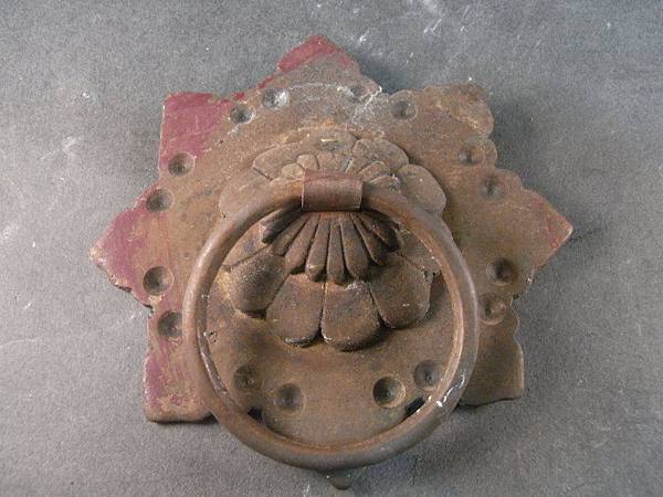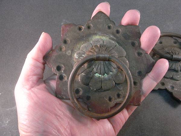 不管是木箱的提把(耳)或是門的銅環,都是木頭鑽洞,然後兩片穿進去,再向外掰開,這樣就固定了。
