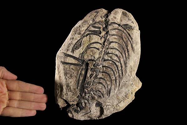 明顯地,骨架與同屬水蜥爬蟲類的中國貴州龍非常相似,但體型大很多,一隻完整的克勞迪歐蜥應該有60公分~1米,當然,價錢也是高不可攀。還好,像這種局部片斷不完整的標本很便宜就是了,幾張小朋友就ok了,有興趣的石友直接跟我回應。若反應不錯,我再試著引進看看!