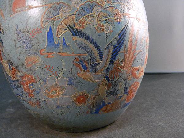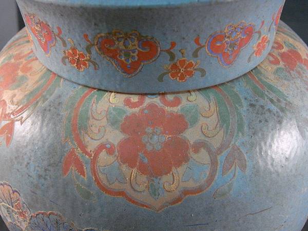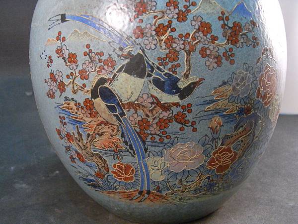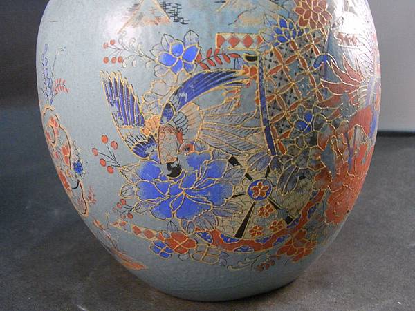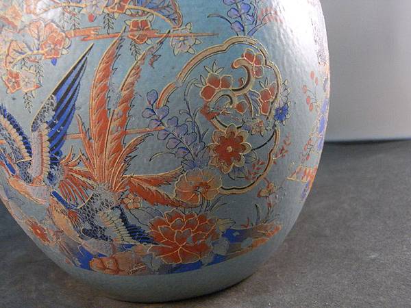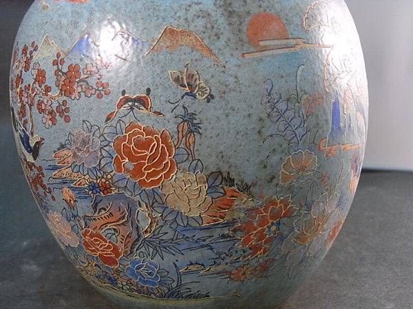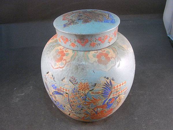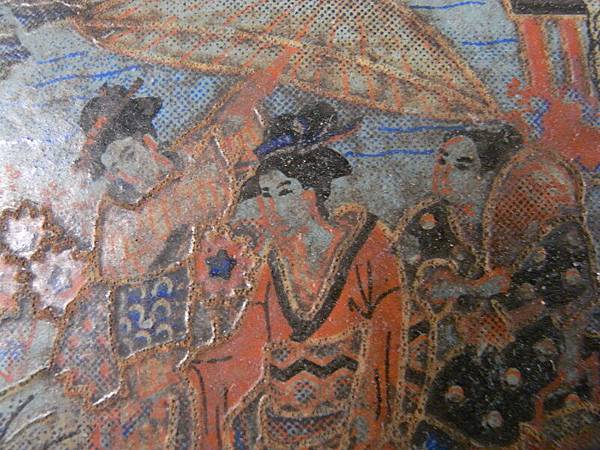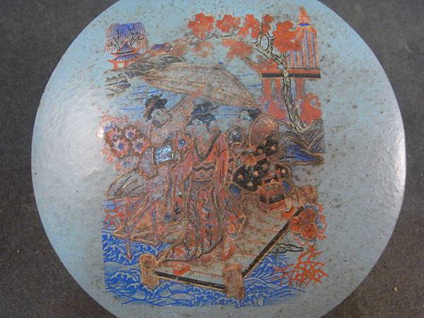 繁複的圖案、鮮豔的色彩、花鳥蝴蝶錦簇、濃濃東洋風,上蓋一個和服貴族女子人家船頭等船、旁邊女侍撐傘、後面男僕大包小包,似乎要遠行....罐上美麗的風景不在話下....