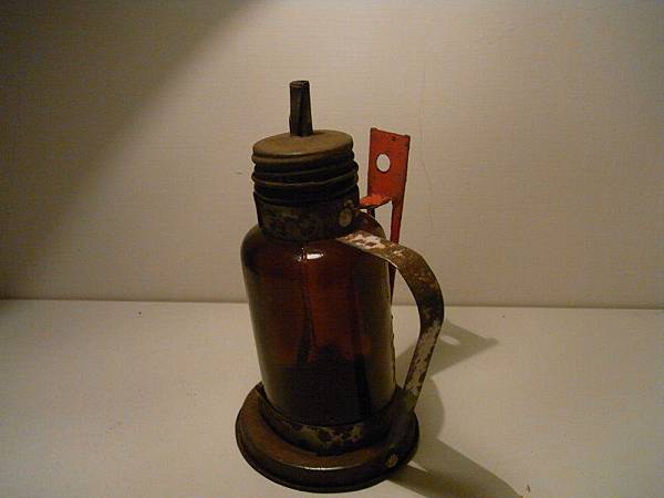 早期愛惜銅鐵物資、重複利用,所以這油燈除了頭蓋,包括把手、底蓋、上下箍鐵,全部都是餅乾鐵盒剪片作成的,所以還看得到鐵片上有各種圖案。