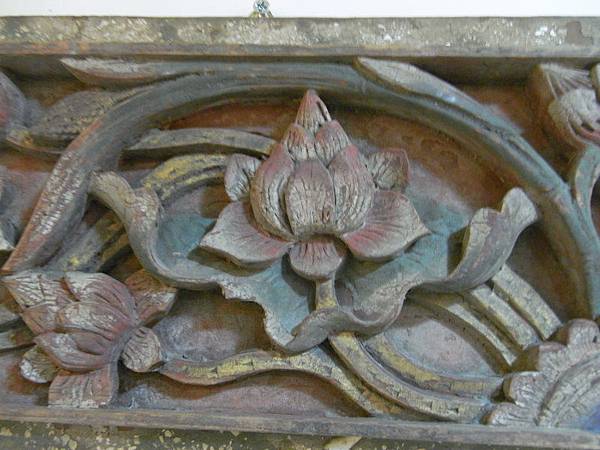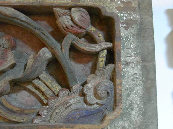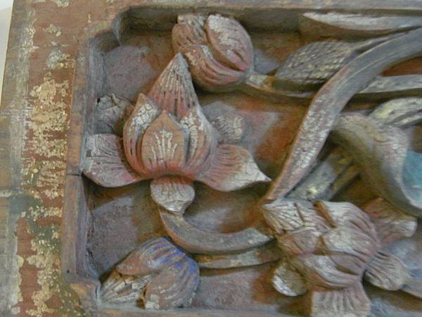 古剔地雕彩繪窗花,約百年歷史,剔地多層次浮雕,彩繪,邊白底石綠螺鈿邊,本件已色彩斑駁、彩作漸層。