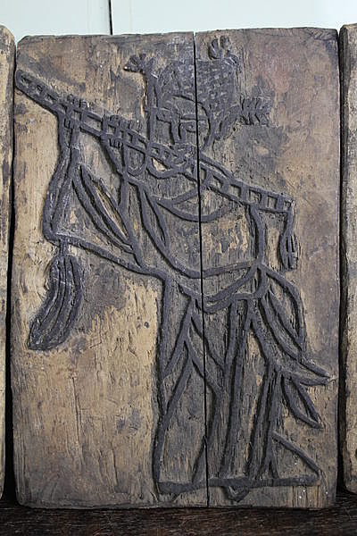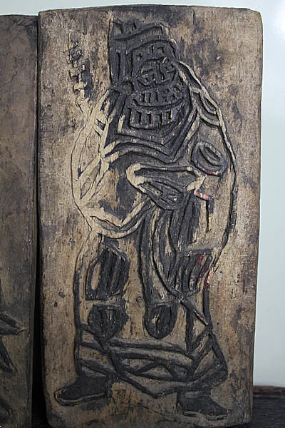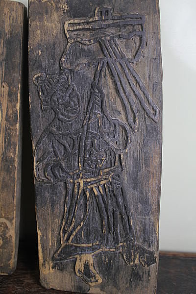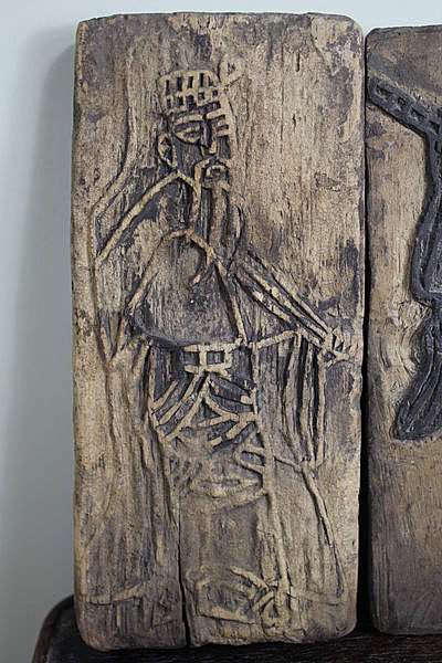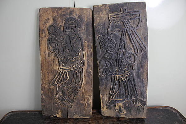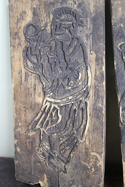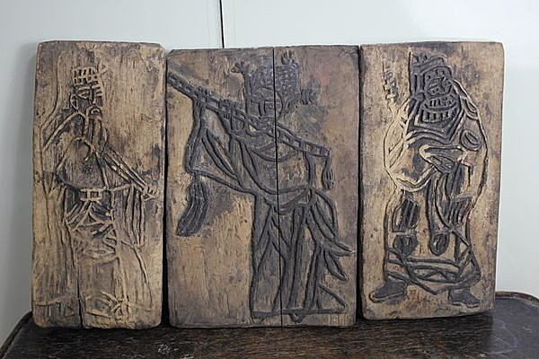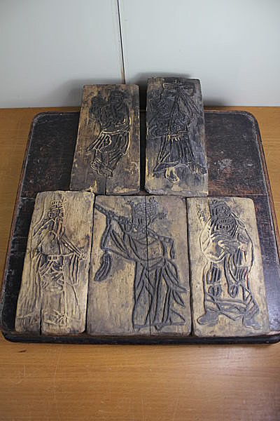 這五片木刻版畫頗有年紀,作用則尚不清楚,其中兩片背面有斑駁的毛筆字,一為福祿壽、二為狀元。觀其圖案人物,除了手轉華蓋的那片背面書寫狀元、著官袍蓄長鬚背面書寫福祿壽之外,其餘似乎也是仙班之列的。故推測可能是過年喜慶貼紅紙之用或作紙錢之用!!??