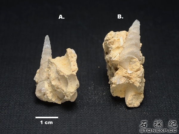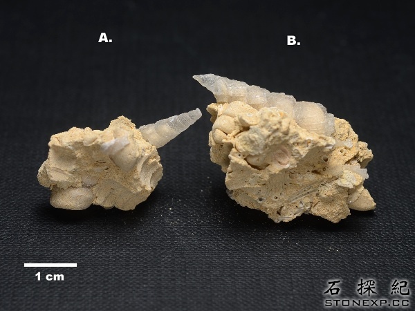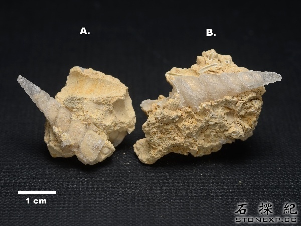 圖一是澳洲南部中新世地層所產出的原生透石膏置換的塔螺化石。塔螺殼形為細長錐形,外觀看似盤旋而上的高塔,會拖著長殼在海底前進或將殼埋入沙泥中,為古代棲息於淺海環境的一種腹足動物。透石膏化塔螺化石原本殼體被透石膏置換因而形成透明的殼體,燈光一照晶瑩剔透,非常漂亮而受到大家的喜愛。
