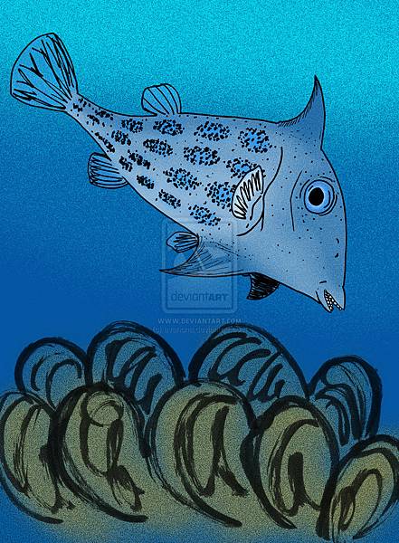 它算是長相怪異的魚,兩旁有像鐮刀狀的棘,一般人會誤以為是腹鰭,但是棘刺喔! 另外口鼻部怪異的牙床有兩排圓齒狀的小牙,推測以貝殼甲殼類為食物,方便磨碎。