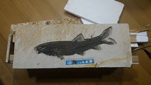 從美國寄回來的大件化石, 阿豆仔裝箱金厚工,拆了十幾根螺絲才見到魚。
