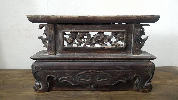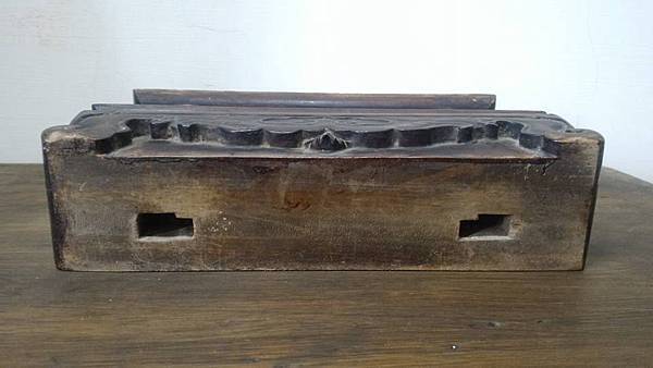 <剛好的百年> 老薦盒,丁巳秋立,推算1917年民初的薦盒,今年剛好百年,新年po上這跟剛好的百年薦盒別具意義 老薦盒兩邊的翹頭及耳朵殘缺,座是一塊實木 底部有榫洞,不知是插入哪裡使用