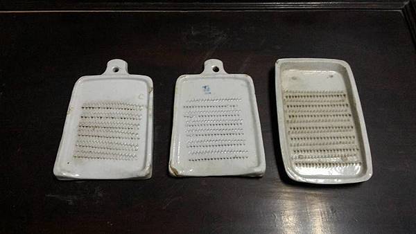 早期磨薑汁或芥茉的器具 這東西在"硘的采衣:台灣早期釉彩陶瓷器物專輯"這本書裡面有介紹 所以我也搞不懂它到底是台灣早期器物或是日本民間器物 因為我看過不少次,亦有跑日本線的商家帶回來賣 超出行情的我是不會買,所以前後就收了這三只 這磨皿現在當然還實用,喜歡吃生魚片的我,可以想像: 悠閒時光,磨著阿里山的山葵,細細品嚐生魚片嗆辣與油甜混合的滋味