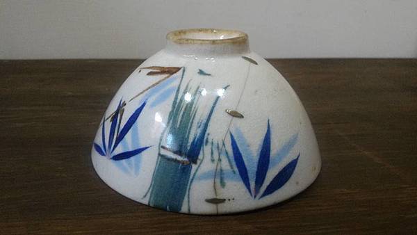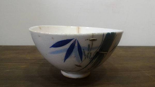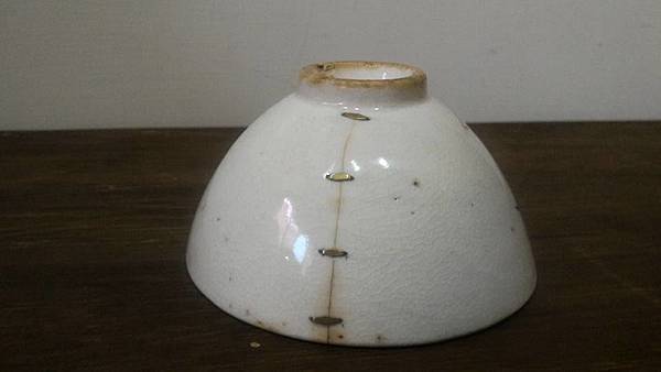 這個焗補碗,釘針還蠻新的,所以推測是年代很淺的鋦補,但碗是老碗。 竹葉是台灣老碗很常見的題材,再加上這個碗口高低起伏不平整,身形又有點扭曲,是典型的變形碗 另外這碗有7個補釘,以現在最便宜一個補釘要200元算來,這碗買的很值得 而且已經有老鋦補一個了,這個新鋦補可以拿來比對。