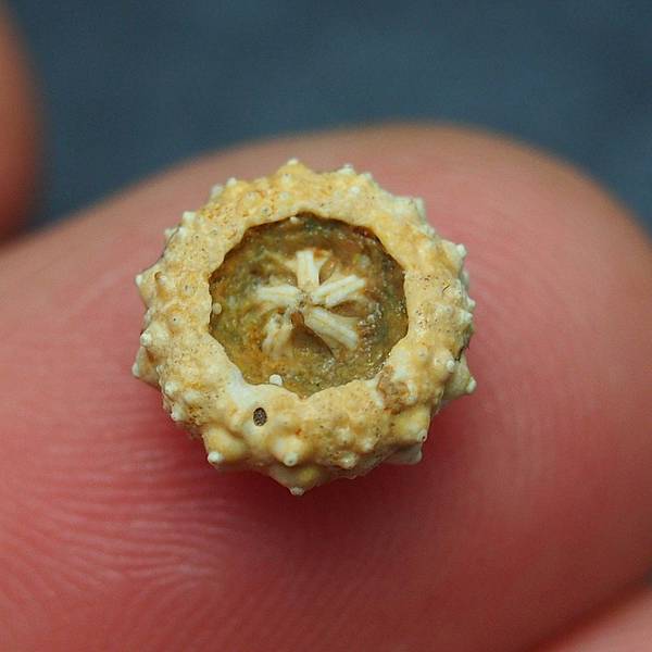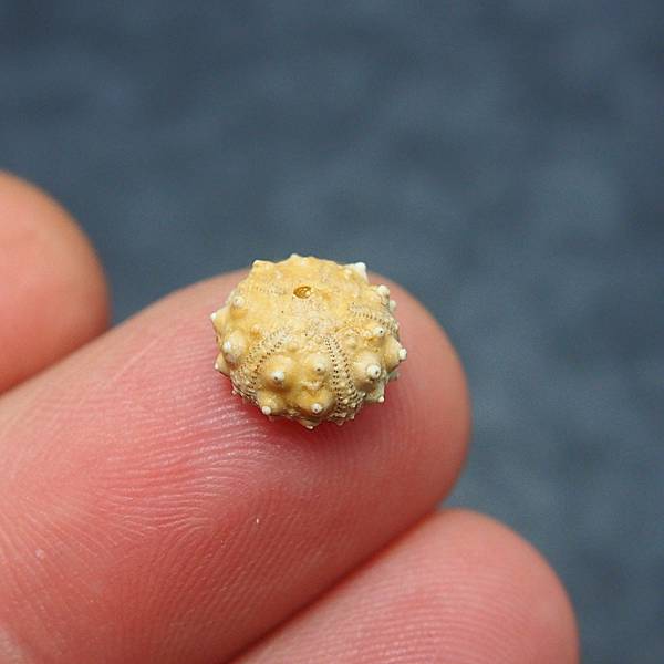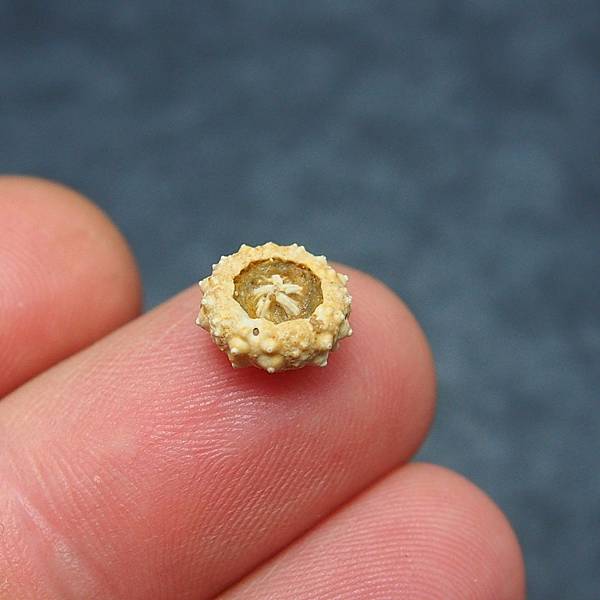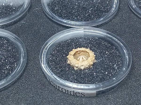 這顆高頂未名海膽產自法國,通常海膽以群聚方式呈現,上面則佈滿眾多的海膽棘刺。這裡的海膽化石保留提燈的機率較大,但有提燈的通常會被挖起來,就像這顆一樣,只不過這顆實在是太小了x<
