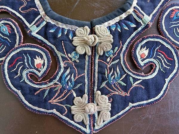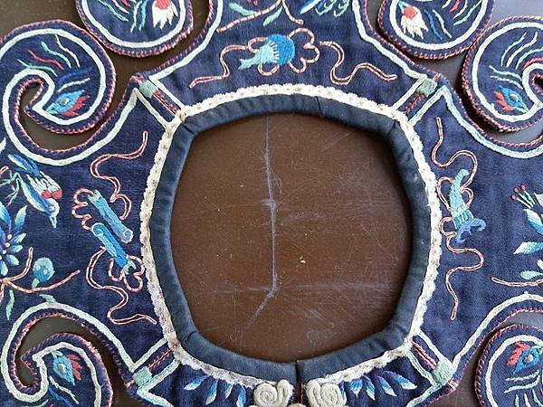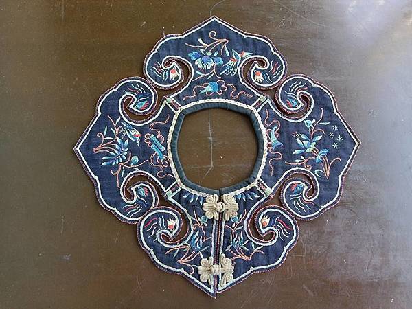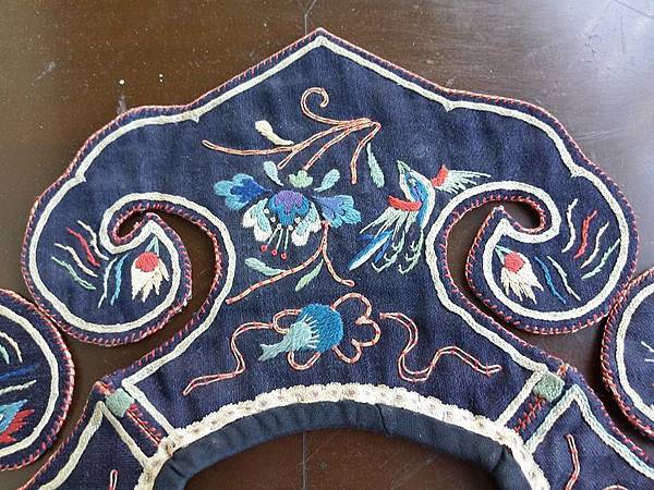 東西南北四如意裡繡有花鳥;如意捲繡作鳳凰頭;頸圍繡有琴、葫蘆與書卷;還有繞繩鈕釦。華麗且有祝福寓意,幸福、多才藝又會讀書。