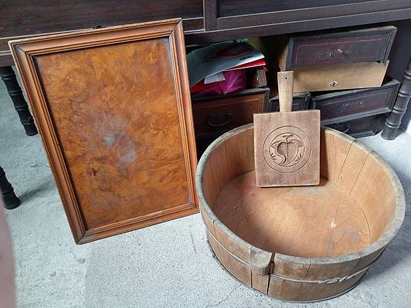 今天整理老家浴室上面 淘到檜木洗衣箍盆、花樟湯盤及粿印 小時候還有印象,跟著媽媽姐姐用這種洗衣盆到竹林溪邊洗衣服 湯盤後面囑名外公的名字,是他作的,他是作家俱的木匠師傅 粿印則還要問清楚來歷 整理老家總有意外驚喜,讓老物重見光明