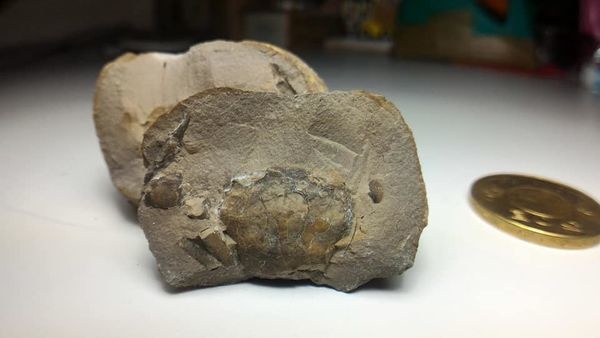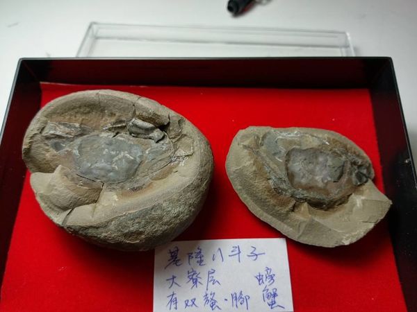 昨天停電無法工作,拿出6顆小結核出來敲 結果6顆中一顆,裡面一隻1cm的迷你古蟹 結核本來就不容易撿了,撿了中獎機率也不高 可見這種結核化石真不容易啊! 這顆是之前敲的,品相算是可以拿出來看的 完整的蟹身,留有幾支腳,還有一支螯