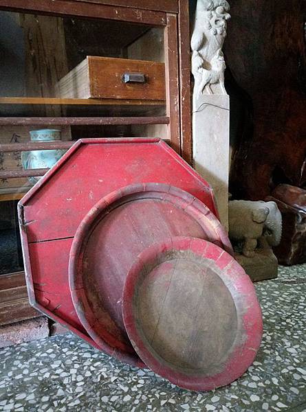 又有人問,收集這些木盤要做什麼? 前面2個圓形木盤是一片一片木片組合起來,然後再用鐵箍去箍緊,這是以前民間的技藝,作得好是滴水不漏的, 所以一是買民間技藝的