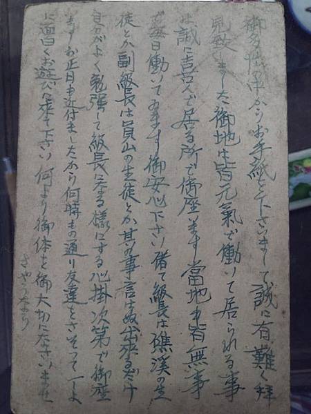 感謝你在百忙之中還捎來信!很高興聽到你們皆一如往常認真上班生活,班長是礁溪的學生,副班長是員山的學生,他們都非常認真的在學習。過年也快到了!照往常找一些好朋友一起過來玩吧!最後請注意身體保健。