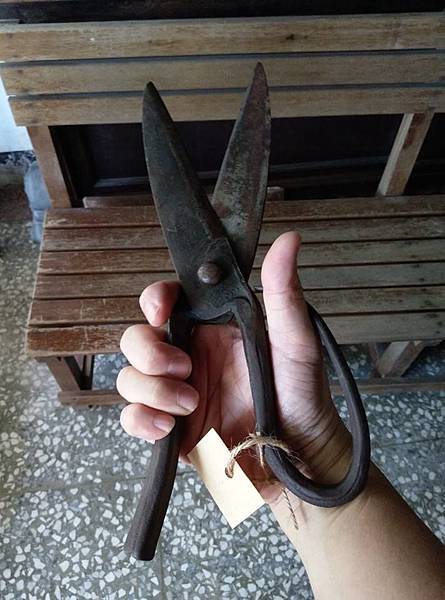 關於被服廠,以前就知道有這樣一個國軍的工廠,常聽長輩講"培武廠",但查不到資料,再改"備武廠"(原本以為是軍備武器廠)還是查不到資料。有次在竹林廟口吃油飯(推薦,50元銅板搞定一碗油飯+魚丸湯),順便問在廟裡聊天的老人,才知道是國軍製作軍服的"備服廠",雖然備服廠還是錯的,但用"服廠"來查,終於查到原來是製作國軍棉被軍服的"被服廠"。而這把剪刀就是棉被軍服裁縫用的剪刀。