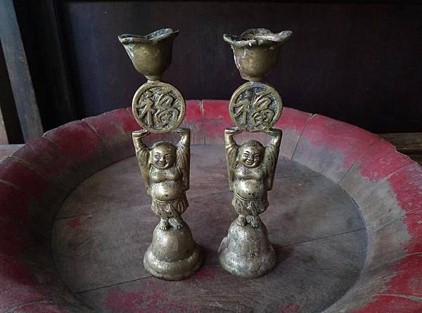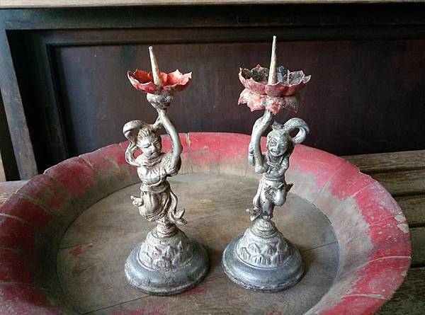 燭台,案桌上的五供之一 從清代的木胎燭台,壽字造形,吉祥寓意 然後是錫製燭台,台座變大變寬,講究者,上面黏龍有鳳,像個縮小的建築,花枝招展 較近代則是工廠生產、造形花瓶狀、單調無味