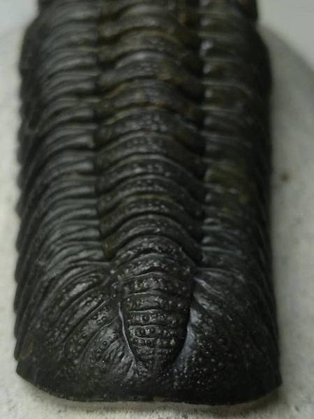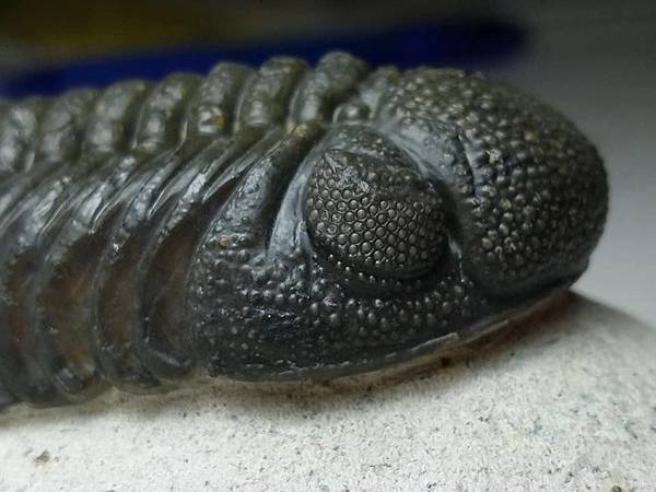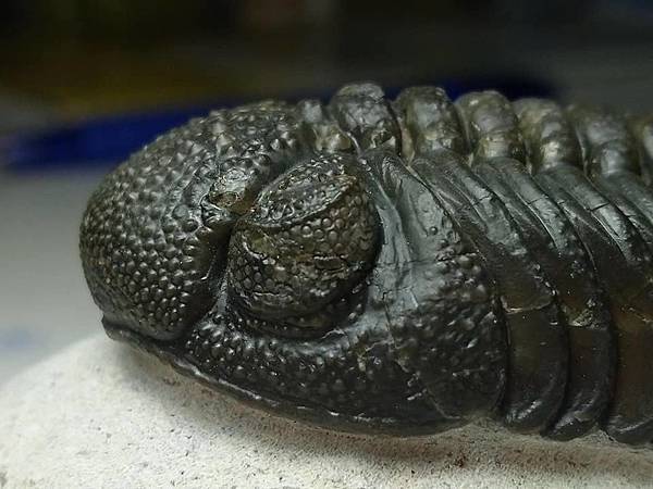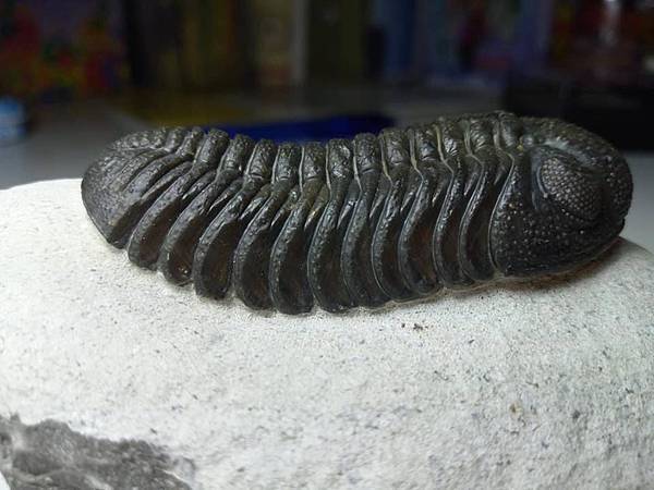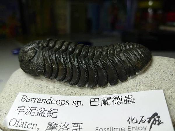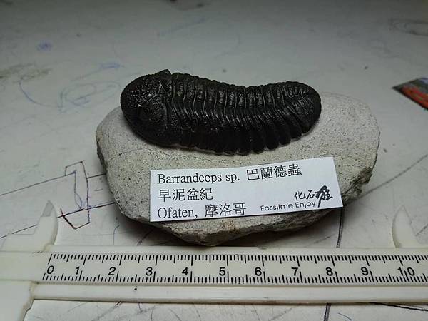 巴蘭德蟲以前會被認為是鏡眼蟲,但是他細緻的差別在哪裡,老實說我一點也不了解。感覺上身型比較長、體節比較多,頭鞍短而膨出。 這隻巴蘭德蟲頭部充滿顆粒疣頭,裂色眼的複眼狀況也很好,右眼完美、左眼稍差,整體在處理乾淨的白色母岩上,黑色的蟲體對比,顯得完整漂亮。