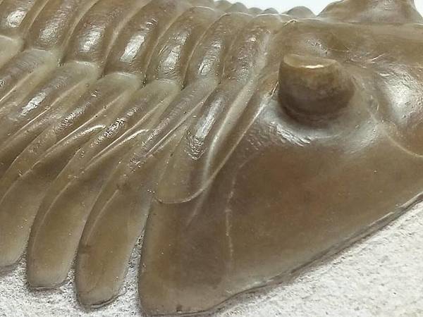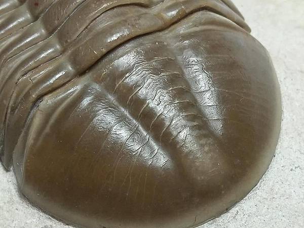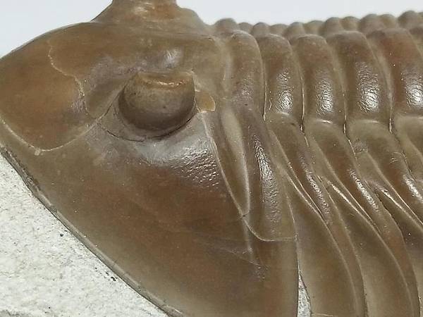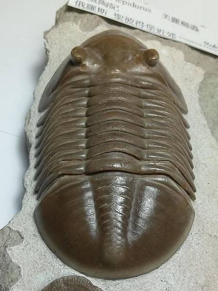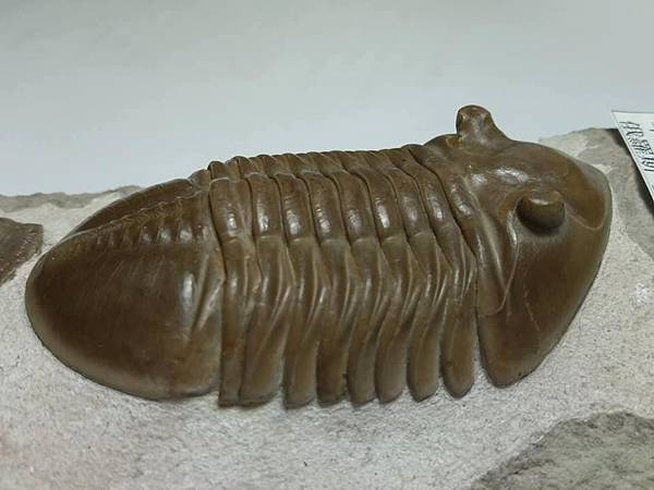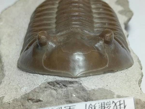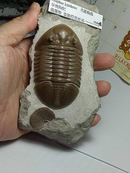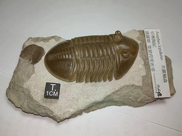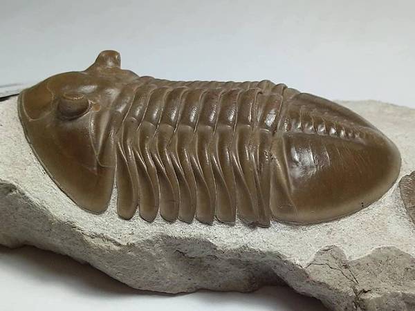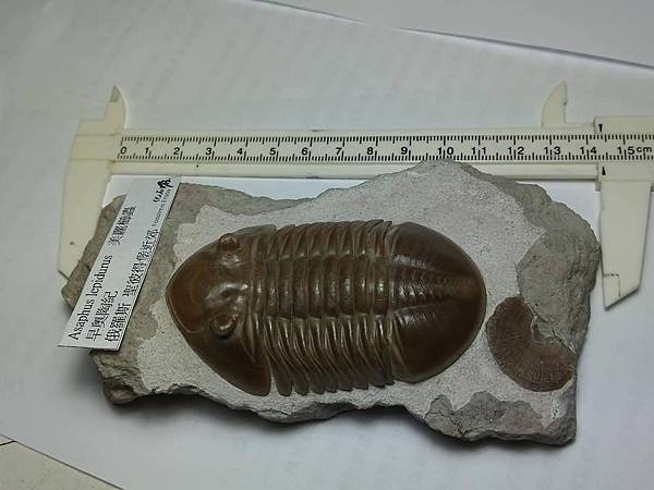 這個標本有兩個特點,一是蟲體約8cm,比一般的尺寸大一點,算是大蟲、二是母岩上面有一個腕足的化石。