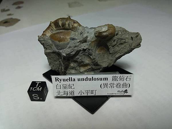 Ryuella菊石也是北海道的異常卷曲菊石之一,殼形有點U形的規則在卷,所以有點日本菊石(Nipponites)的味道,其發達隆起的肋條上有突出的棘,整個形態有點像翻騰的龍,所以我把它確定翻譯成"龍菊石"。