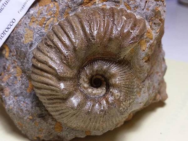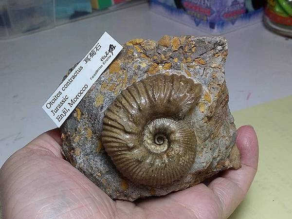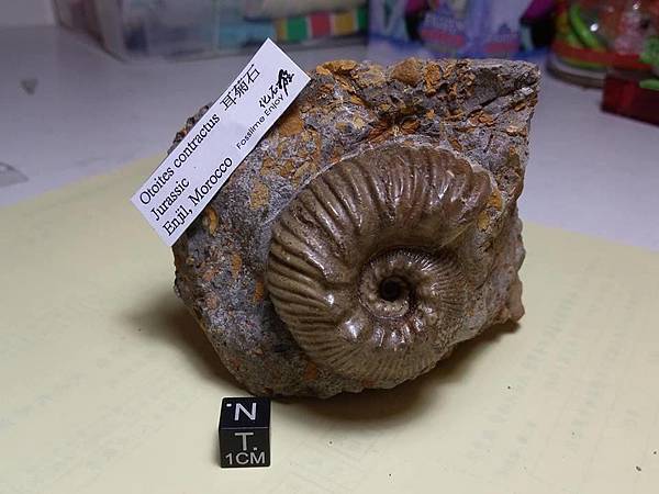 耳菊石身體呈筒狀,寬鬆的肋條延伸至腹側,讓腹側像輪胎一樣。 肋條另一端向臍心延伸至一半交結於結節。殼的內環窄小、外環寬大,雖然內環窄下,但上面的結節依然粗壯明顯。 菊石長約5.7cm,母岩裁切好擺飾