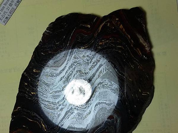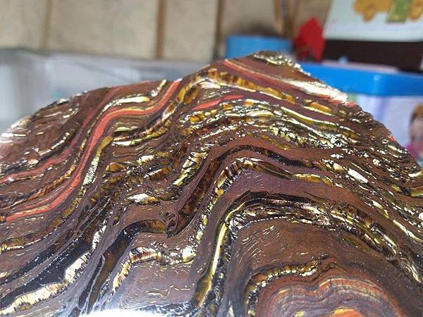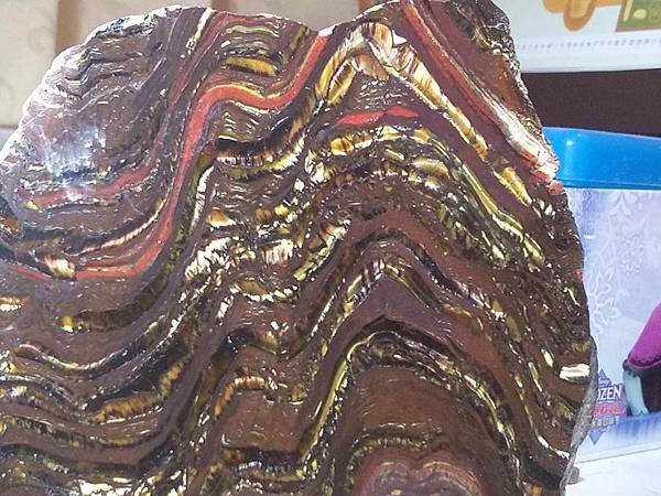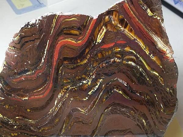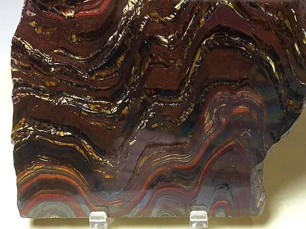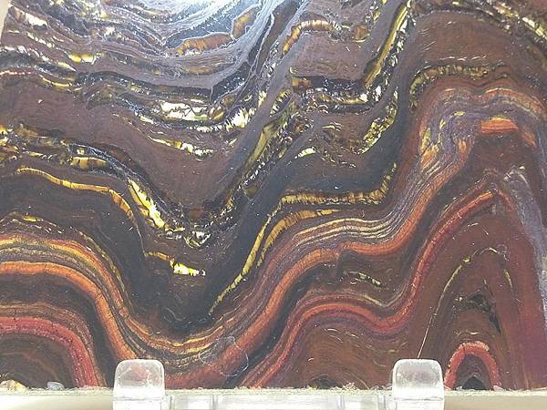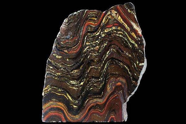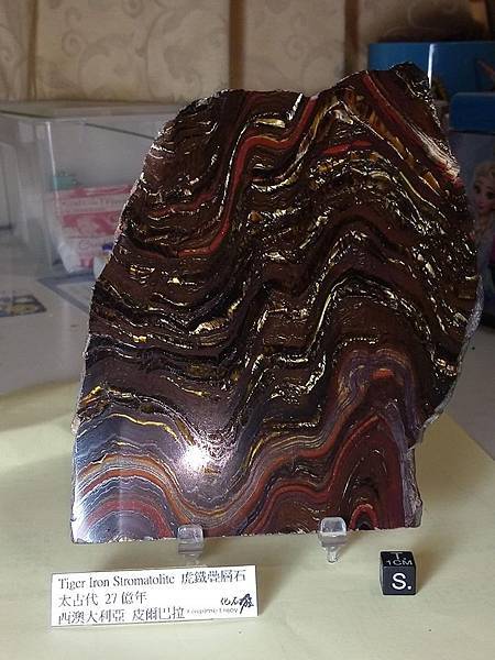這塊石板被稱作虎鐵疊層石 (Tiger Iron Stromatolite),產自於24億年前太古代的西澳大利亞皮爾巴拉。它的重要意義在於製氧及產鐵,海洋的微生物利用陽光、二氧化碳及水行光合作用製造自己需要的醣類養分,同時釋放出氧,就是所謂的"富氧事件",地球複雜生命需要的氧氣就是這樣來的;而氧與海洋裏的鐵元素結合形成不能溶解的赤鐵礦,這也是地球上我們使用鐵的鐵礦來源。