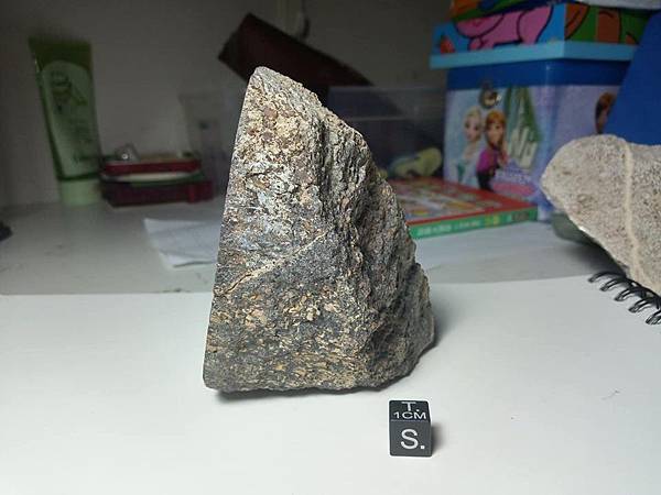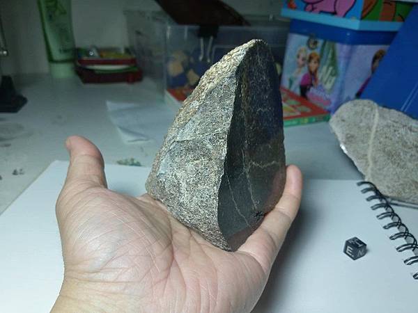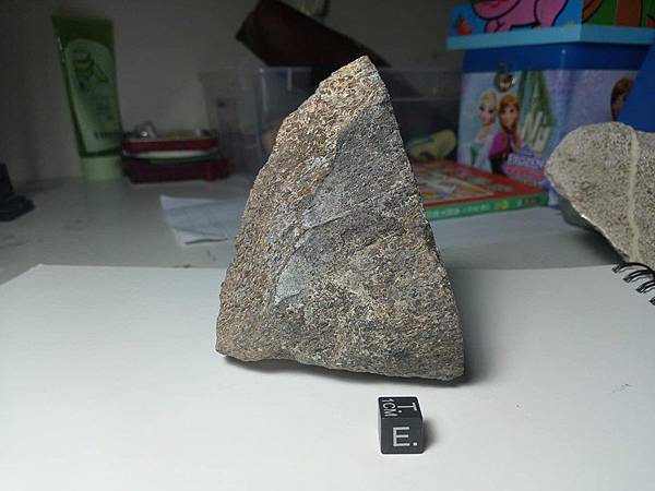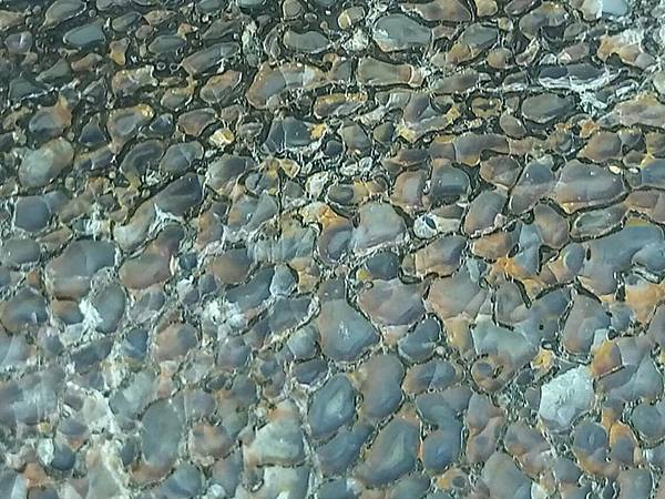 這件迷人的地方在於拋光的表面宛如洗石子牆面且有顏色變化,雖然平面卻有立體小石頭的感覺。(圖一)