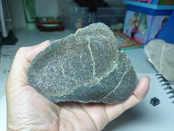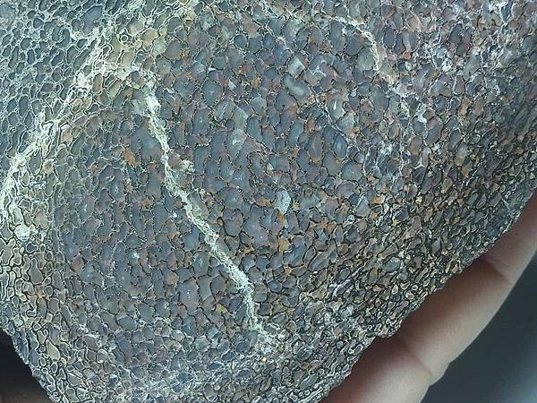這是一塊手掌大小、立體的恐龍骨頭,經過拋光處理,可以很容易地看到漂亮的內部單元結構(海綿骨孔隙)。幾乎可以肯定是像莫里森組中常見的大型蜥腳類恐龍-圓頂龍。矽化恐龍骨是一種罕見的化石恐龍骨,其原始的化石骨已經被二氧化矽基的化合物(瑪瑙,碧玉,玉髓或蛋白石等)所填充,才會拋光後有這麼美麗的顏色與紋路。