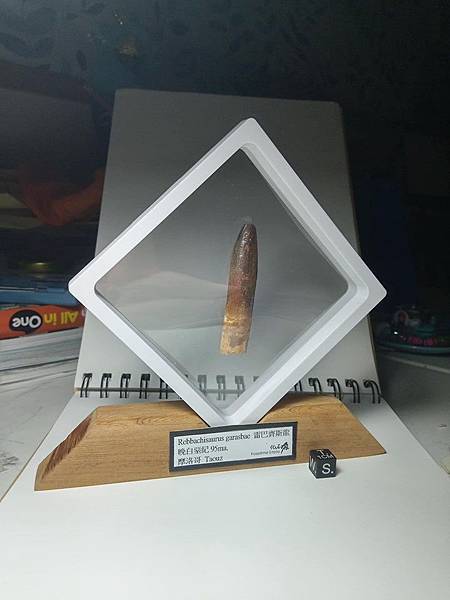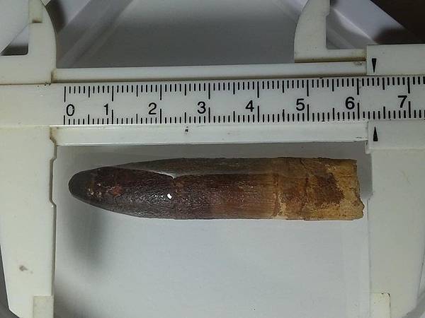 此件特別加上台灣檜木底座,是我用老台灣檜木衣櫥報廢後回收的老木料做成,散發濃濃的檜木香氣。牙齒長達6cm以上,牙皮紋路漂亮,但有些修補,所幸修補的很自然。