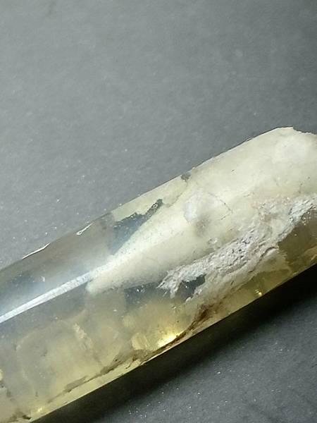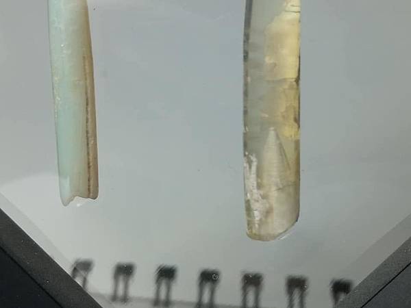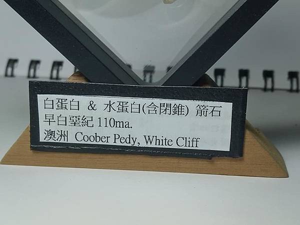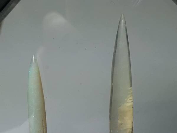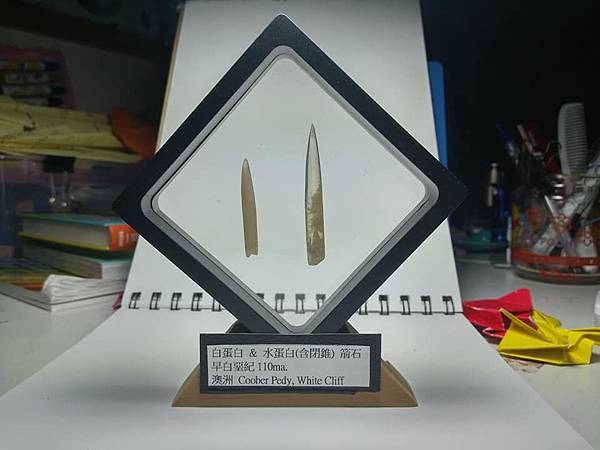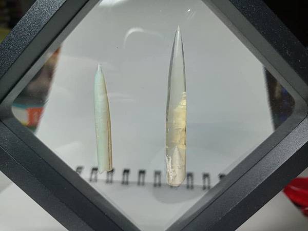 這是蛋白石化(Opal)的箭石,左邊是白蛋白,呈現乳白色稍有火光;右邊是水蛋白,透明狀,後段可以看到清楚的閉錐。台座是自製的台灣檜木台座。