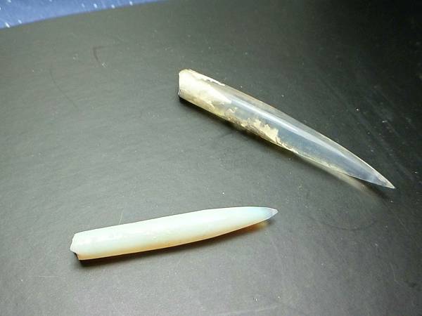 最後一張圖即是箭石示意圖(網摘圖),護甲就是鞘,變成化石後就是箭石。史前烏賊的鞘遠比現在的烏賊發達很多。