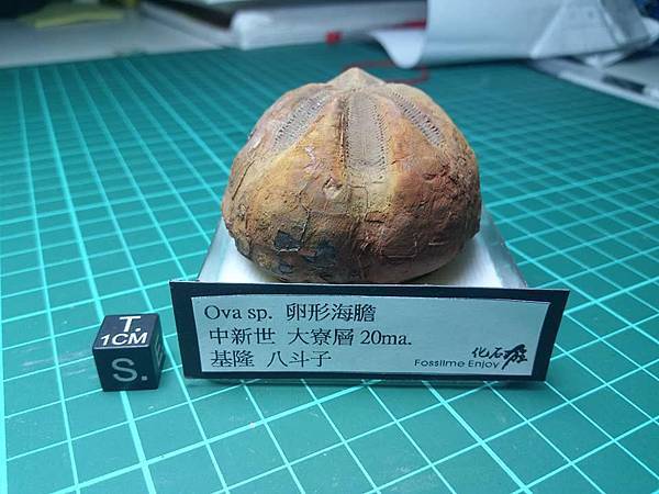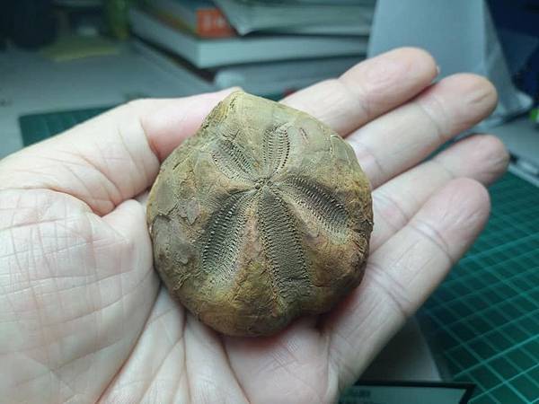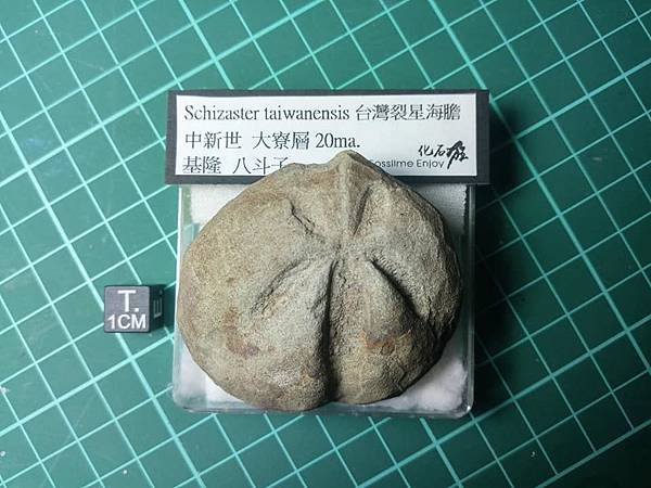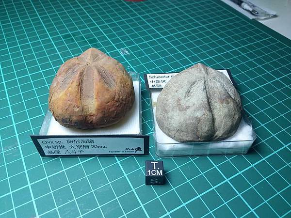這兩顆海膽同屬於裂星海膽科,外觀看起來頗像,但由體形跟瓣帶紋來看仍有差異,屬於不同的品種。 左邊那顆比較高聳,接近立方體,瓣帶紋形狀也明顯不同,是為卵形海膽,數量非常稀少。 右邊較為扁平、寬胖,是為一般常見的台灣裂星海膽。 這兩顆都是在同時間同地點撿到,出野外這麼多次來還是第一次,真是不容易。